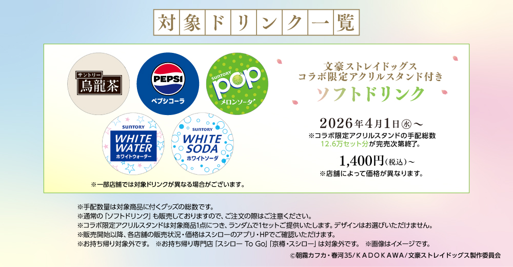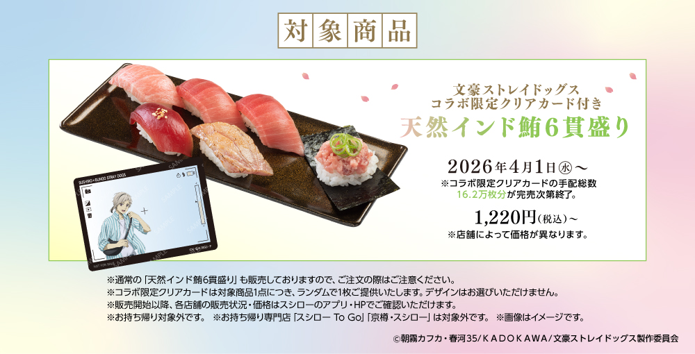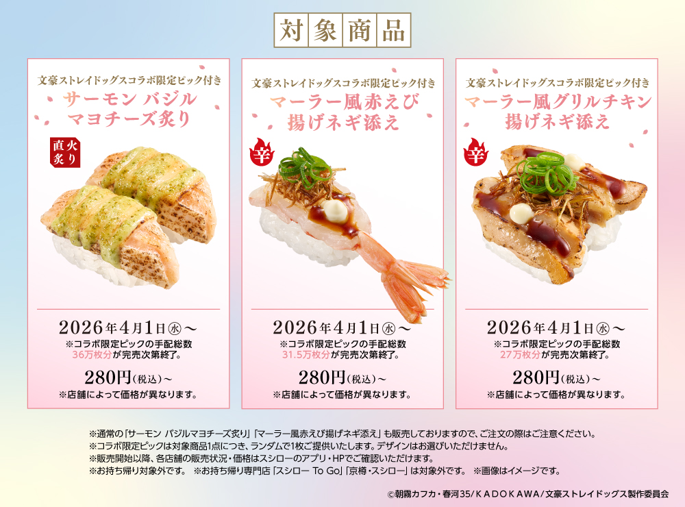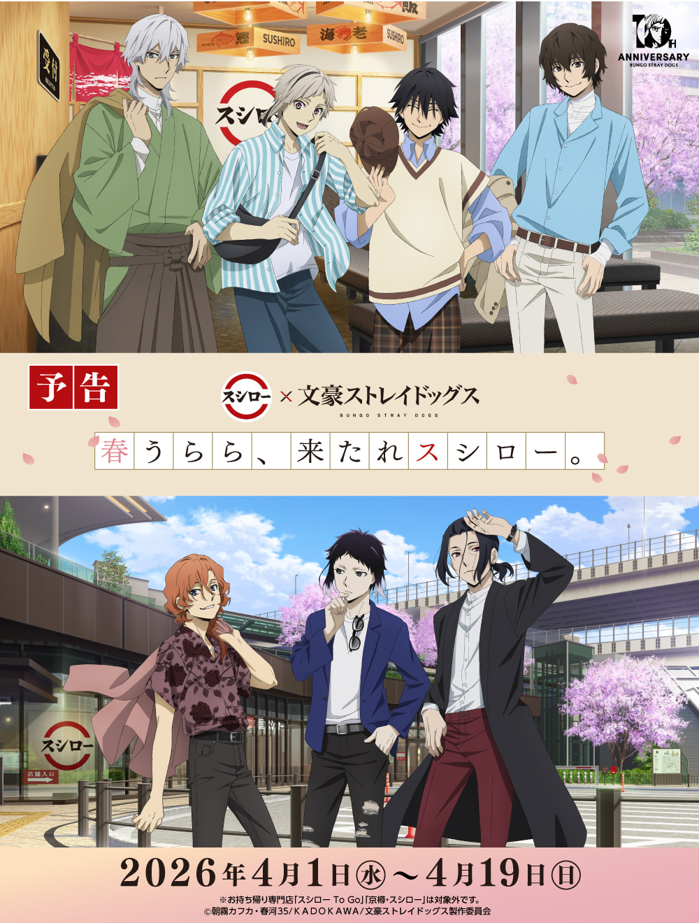 ぜひこの機会に全国のスシローで、アニメ10周年を迎える『文豪ストレイドッグス』とともに、春ならではのコラボレーションをお楽しみください。